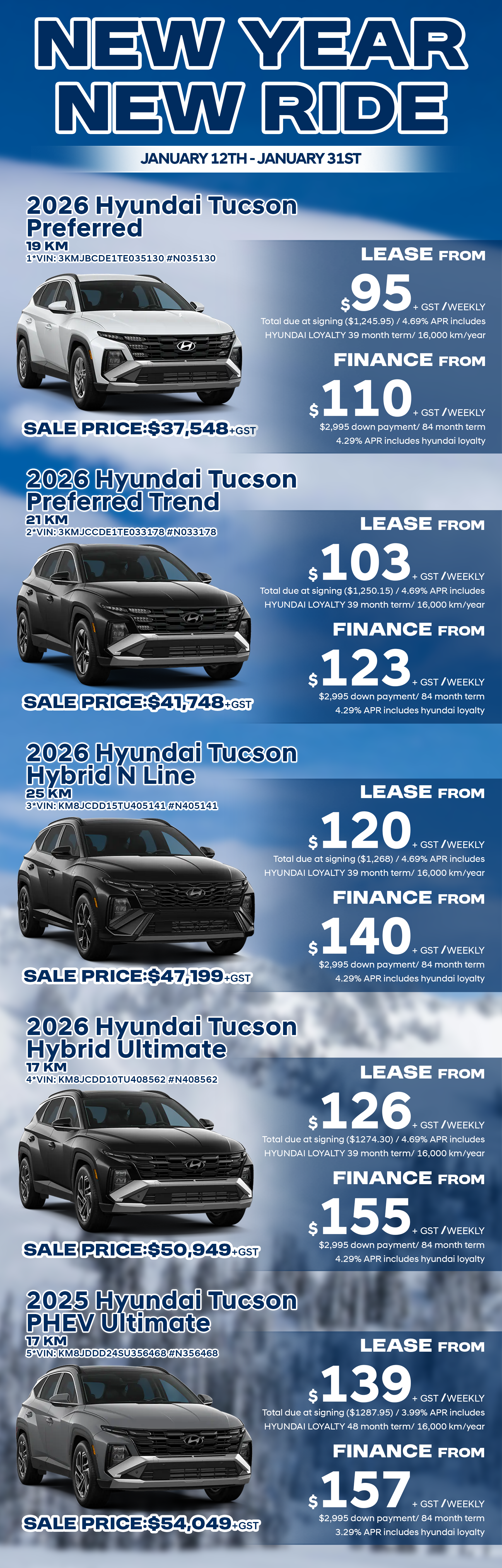 Offer expires 01/31/2026. Don’t pay for 90 days on all models. Based on monthly payments, finance purchases only; restrictions apply. Payment reflects Hyundai Loyalty incentive. Offer valid for eligible current Hyundai owners only. Finance offers include a 0.5% rate reduction, and lease offers include a 1% rate reduction. Conditions apply. Finance offers: 1*. Total Interest: $5,758.30; 2*. Total Interest: $6,455.36; 3*. Total Interest: $7,360.04; 4*. Total Interest: $7,992.42; 5*. Total Interest: $8,496.91. Lease offers: 1*. Residual Value: 68%, $25,329.32; 2*. Residual Value: 70%, $28,664.30; 3*. Residual Value: 71%, $32,623.79; 4*. Residual Value: 70%, $34,964; 5*. Residual Value: 56%, $30,827.44. Lease km are set to 16000km per year. Excess km will be charged at $0.12 cents per km. Prices do not include GST. Payments are O.A.C. Offers are available for a limited time and are subject to change or cancellation without notice. Vehicle colour is subject to availability. Inventory is limited; dealer order may be required. Offers cannot be combined with other promotions, are non-transferable, and cannot be assigned.